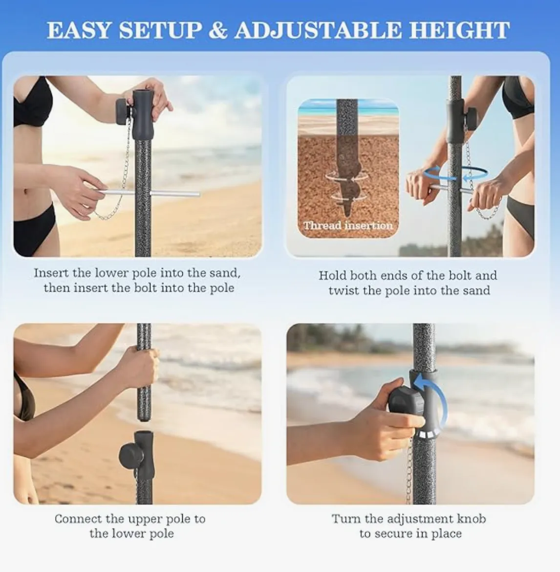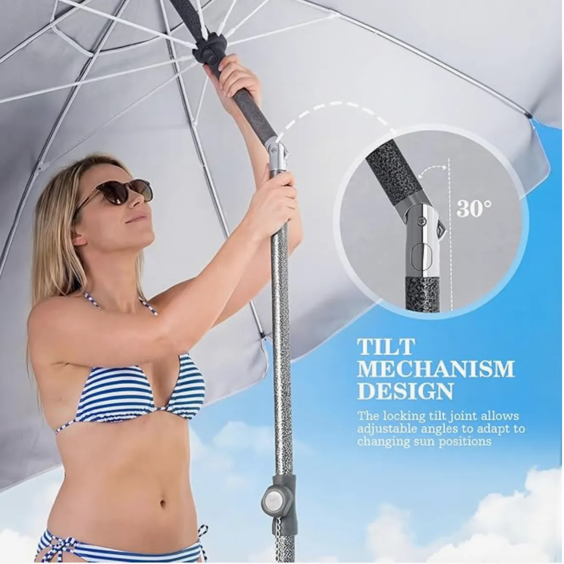 Stay cool and shaded under our heavy dutyy windproof beach umbrellas — a must-have for sunny days on the sand. -Provides generous UV protection -8.5ft and vented for airflow -Easy to set up with sturdy screw in pole -Great for families, couples, or solo loungers